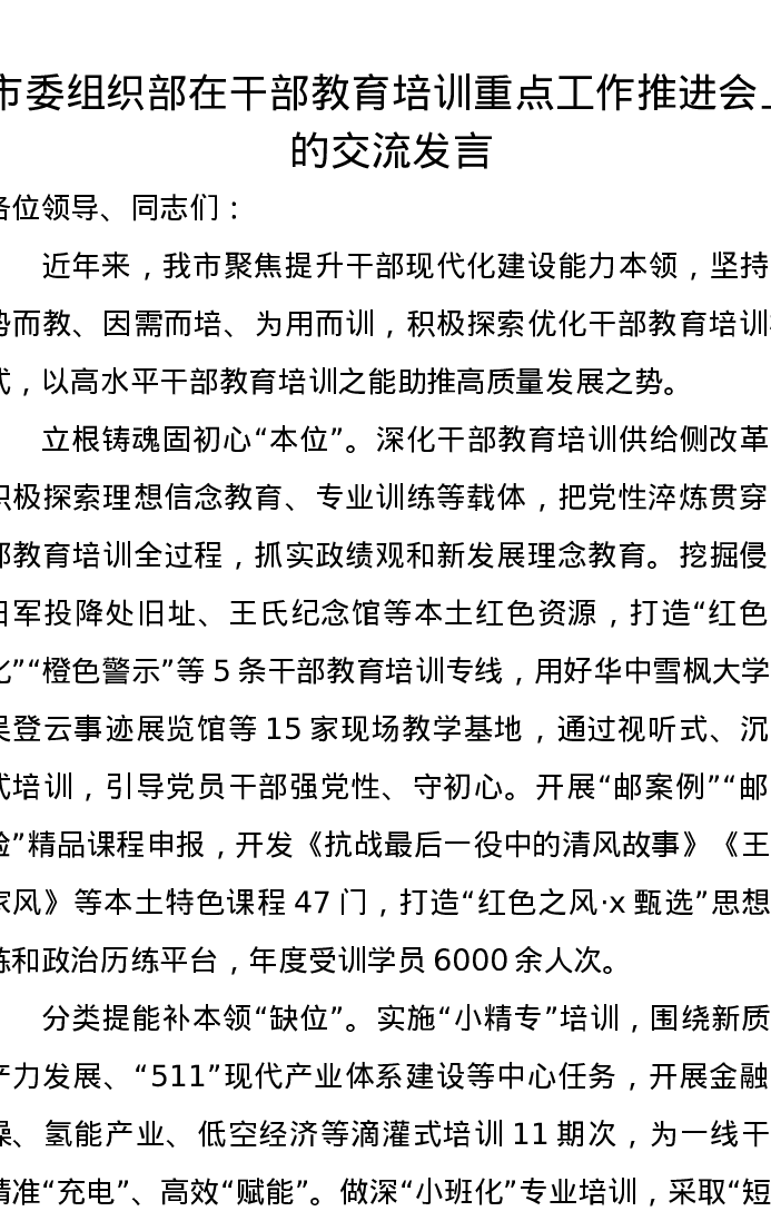 市委组织部在干部教育培训重点工作推进会上的交流发言