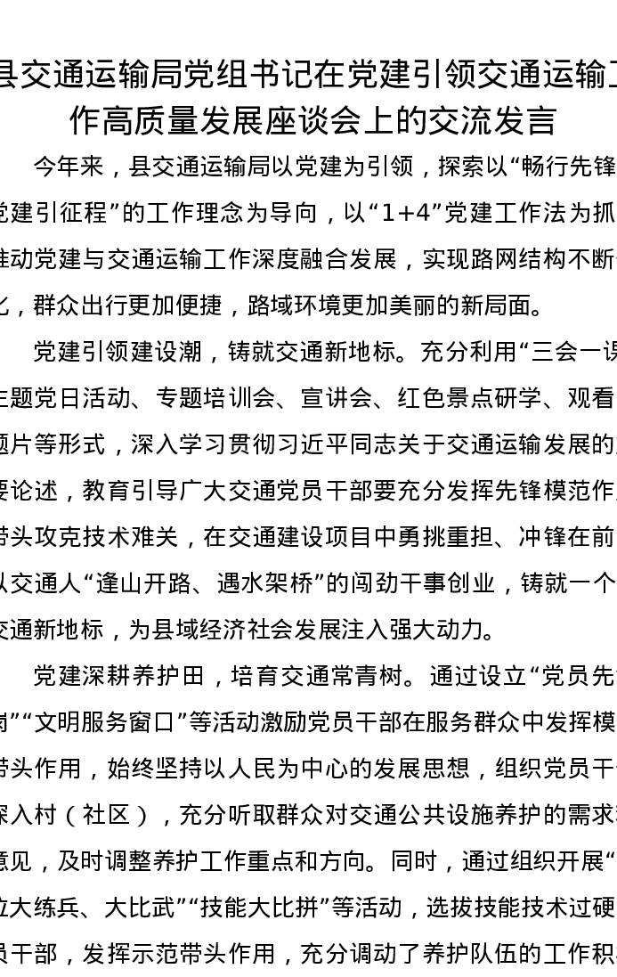县交通运输局党组书记在党建引领交通运输工作高质量发展座谈会上的交流发言