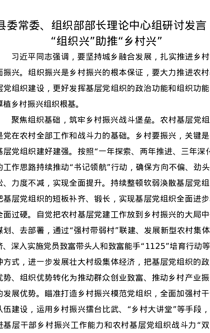 县委常委、组织部部长理论中心组研讨发言:“组织兴”助推“乡村兴”