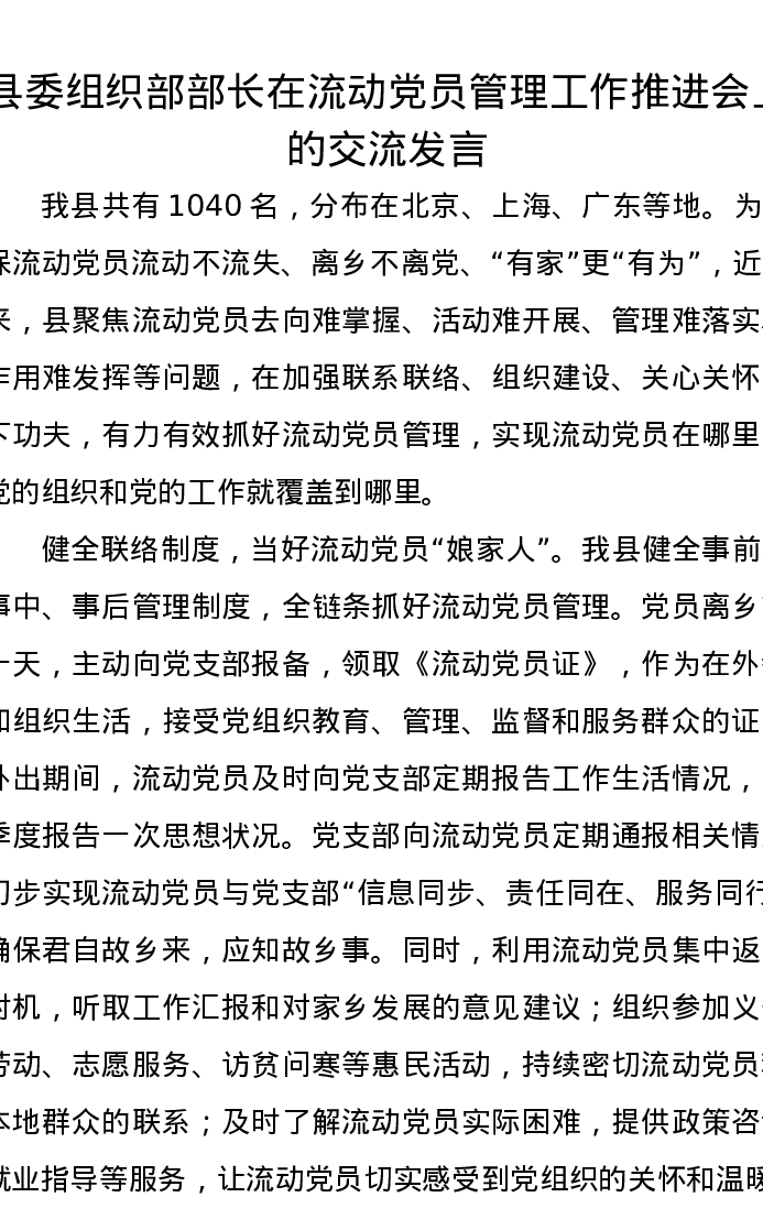 县委组织部部长在流动党员管理工作推进会上的交流发言
