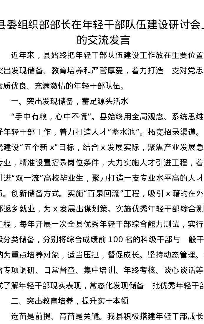 县委组织部部长在年轻干部队伍建设研讨会上的交流发言