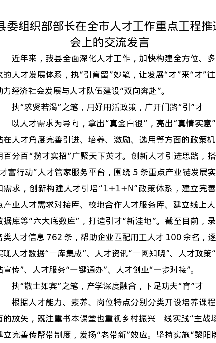 县委组织部部长在全市人才工作重点工程推进会上的交流发言