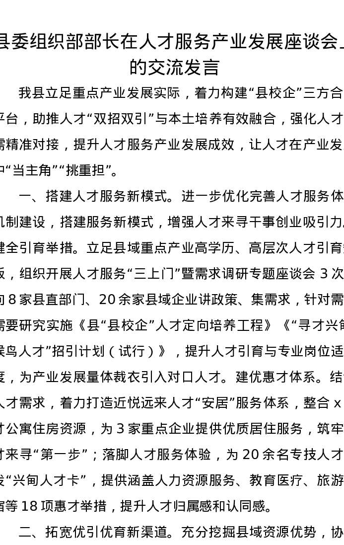 县委组织部部长在人才服务产业发展座谈会上的交流发言