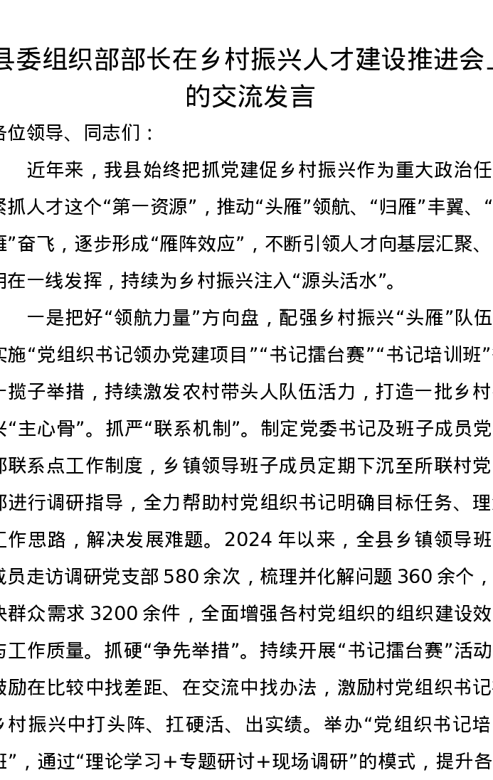 县委组织部部长在乡村振兴人才建设推进会上的交流发言