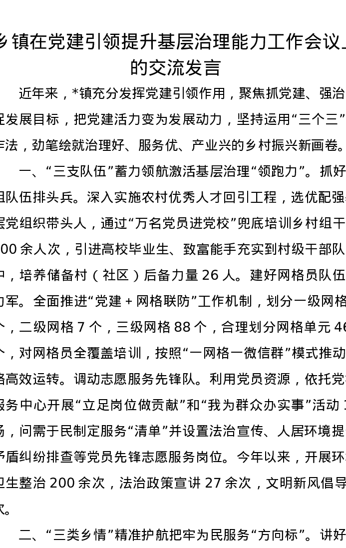 乡镇在党建引领提升基层治理能力工作会议上的交流发言