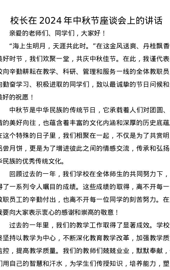 校长在2024年中秋节座谈会上的讲话