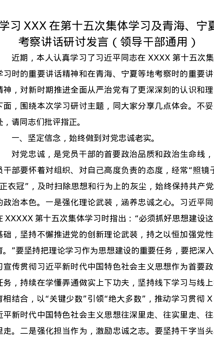 学习XXX在第十五次集体学习及青海、宁夏考察讲话研讨发言(领导干部通用)
