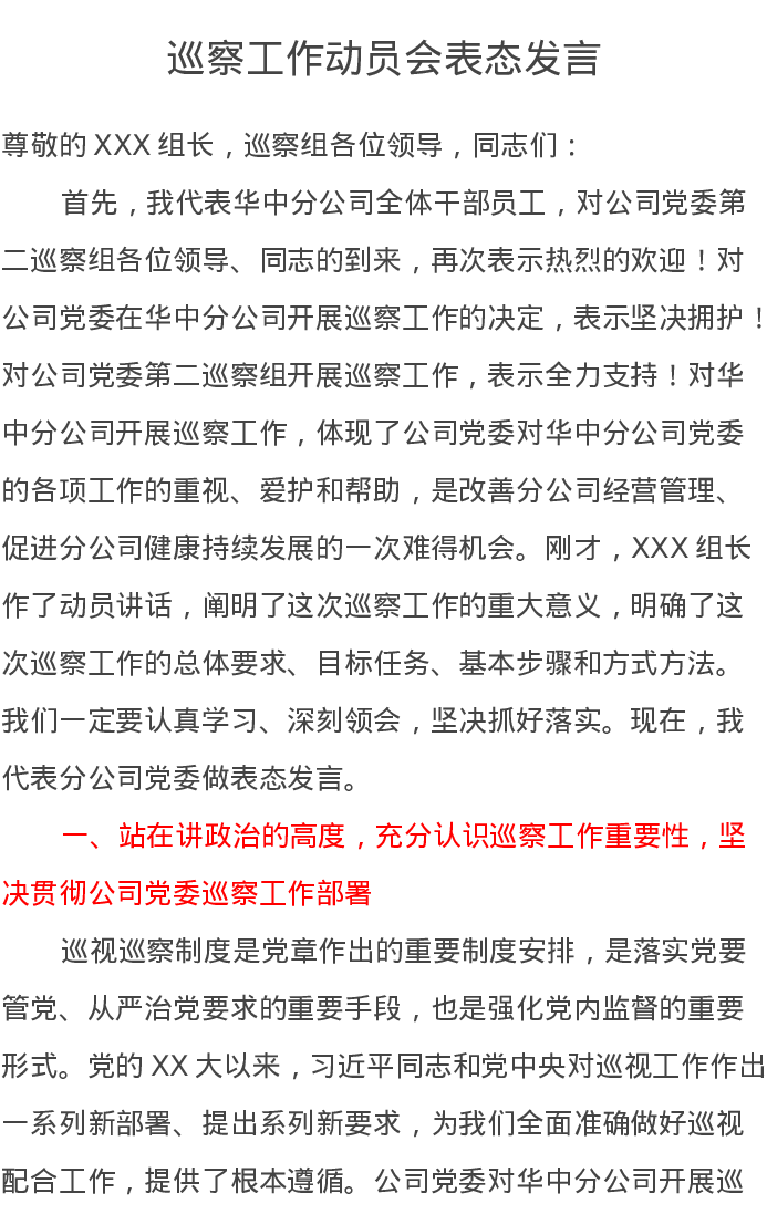巡察工作动员会表态发言