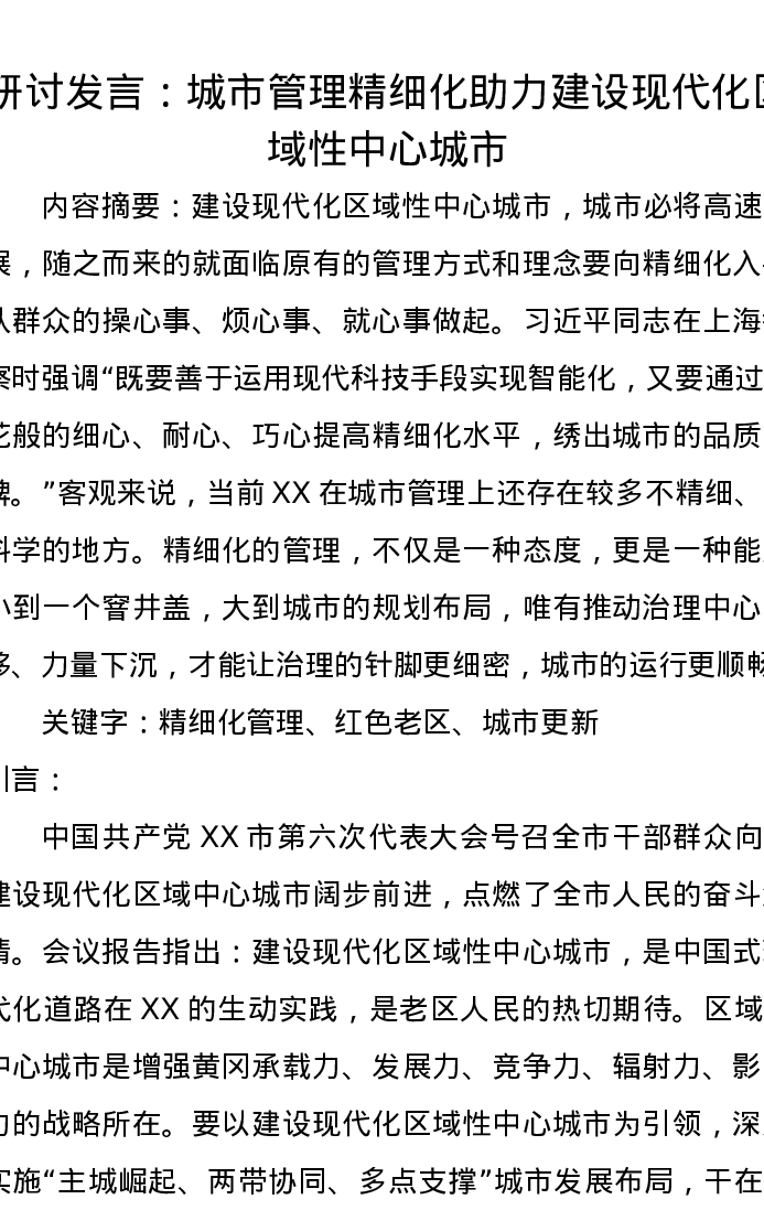 研讨发言:城市管理精细化助力建设现代化区域性中心城市