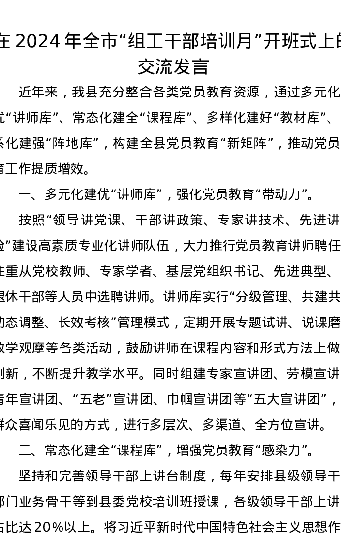 在2024年全市“组工干部培训月”开班式上的交流发言