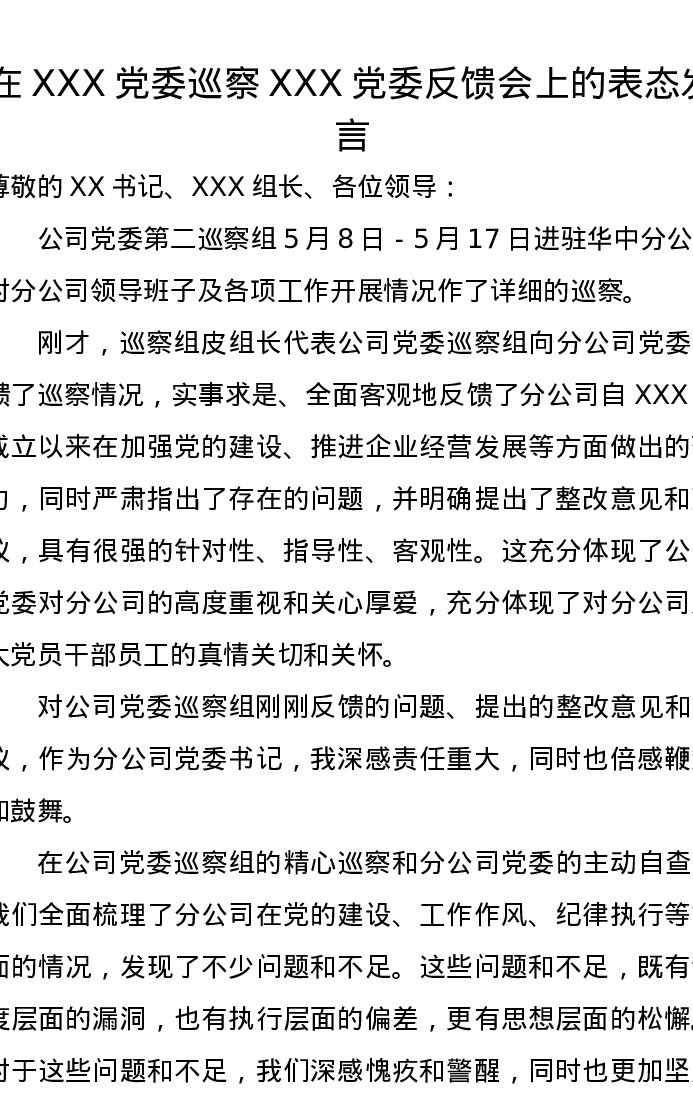 在XXX党委巡察XXX党委反馈会上的表态发言