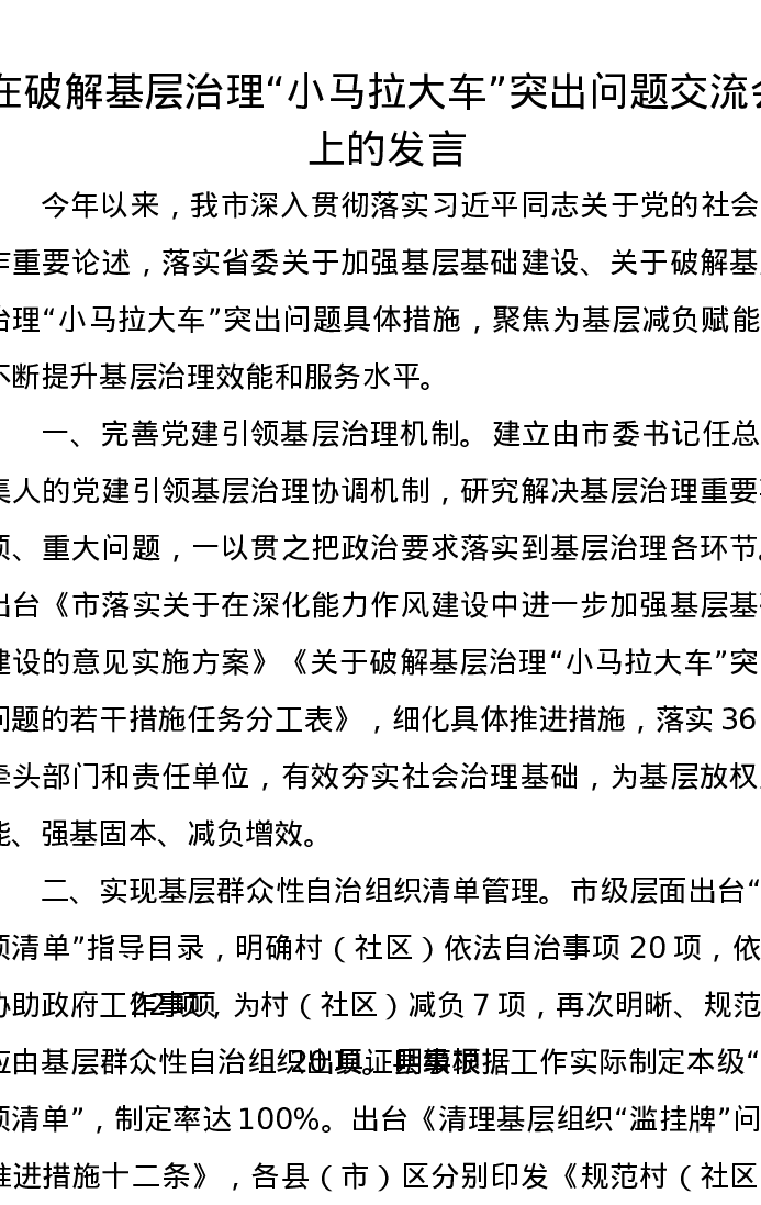 在破解基层治理“小马拉大车”突出问题交流会上的发言