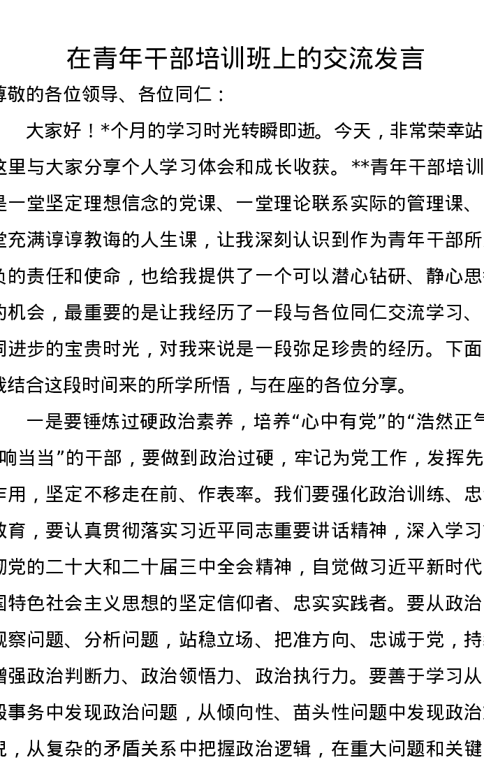 在青年干部培训班上的交流发言