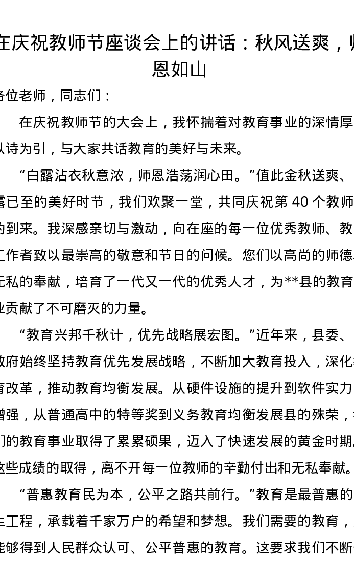 在庆祝教师节座谈会上的讲话:秋风送爽,师恩如山