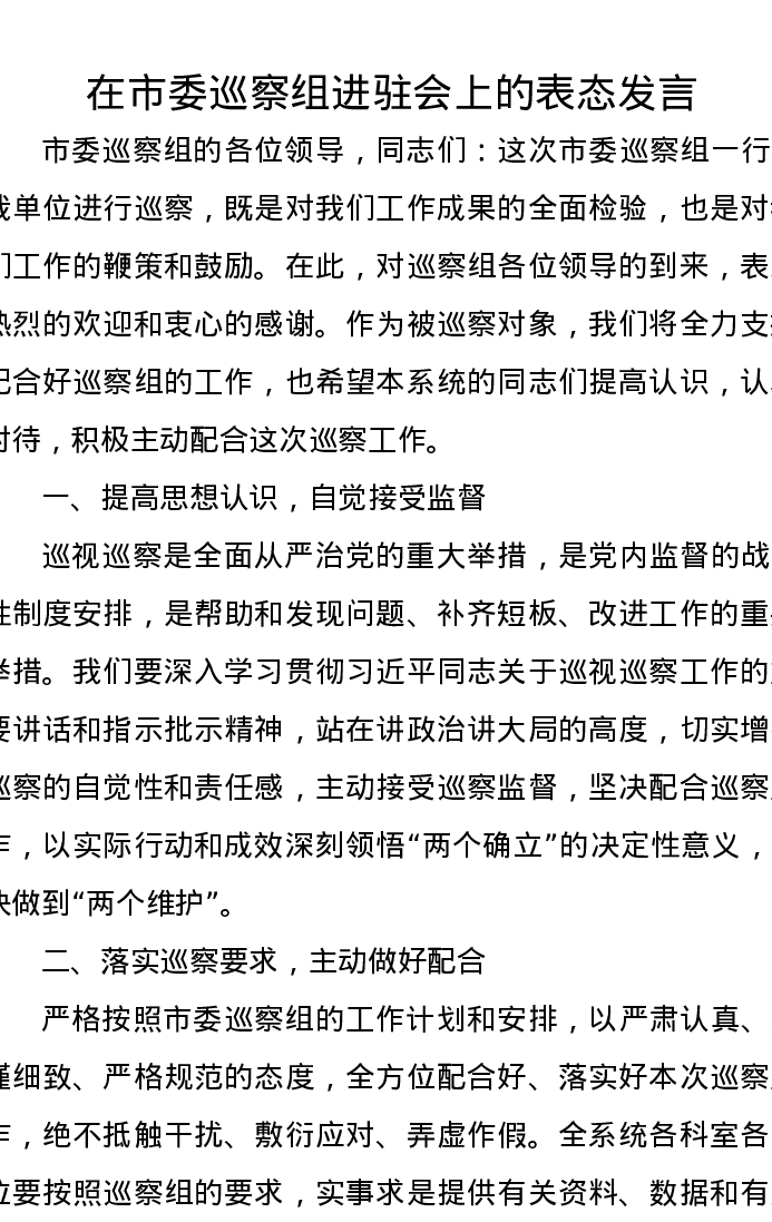 在市委巡察组进驻会上的表态发言