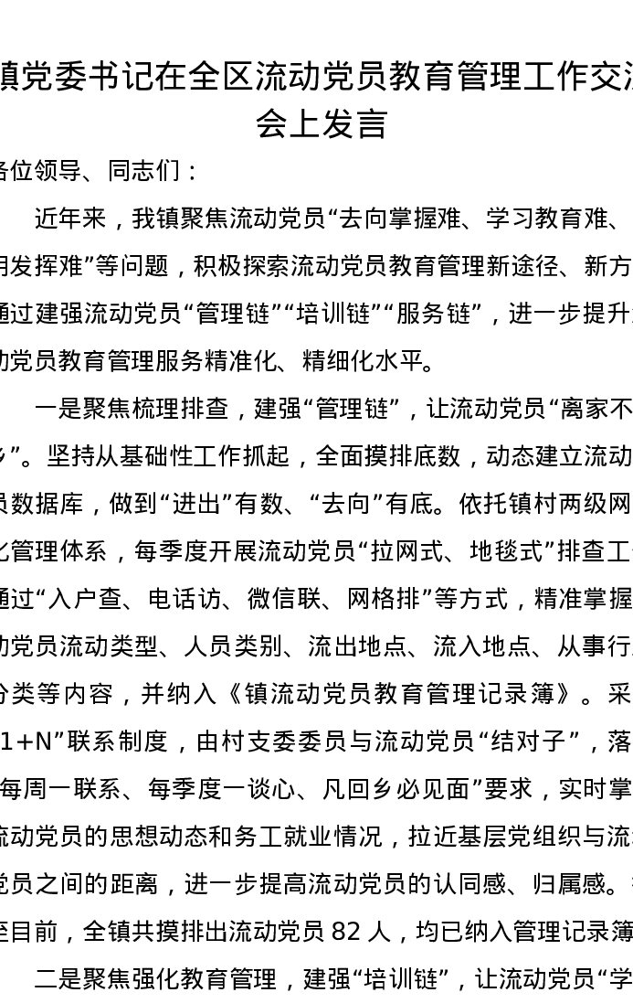 镇党委书记在全区流动党员教育管理工作交流会上发言