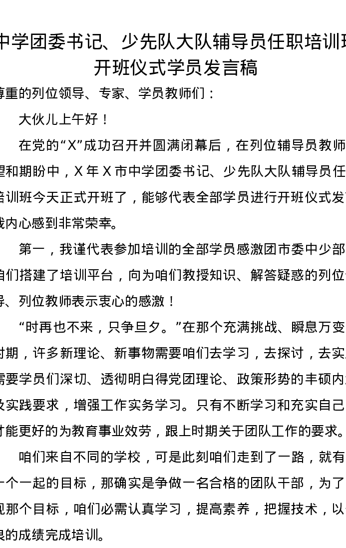 中学团委书记、少先队大队辅导员任职培训班开班仪式学员发言稿