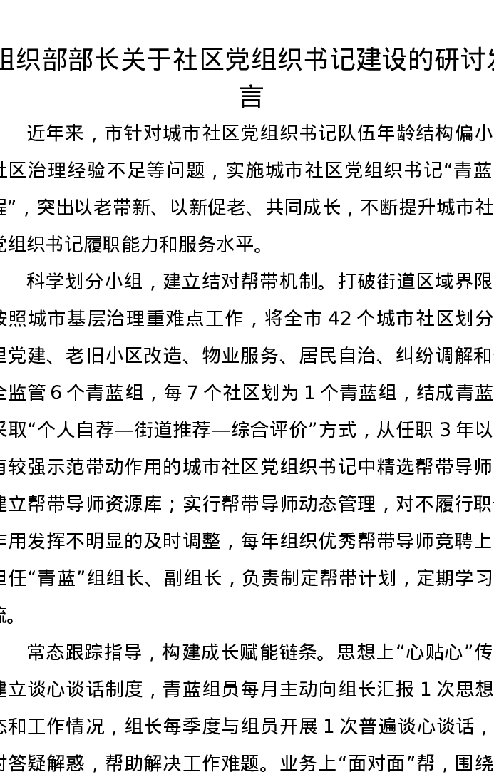 组织部部长关于社区党组织书记建设的研讨发言