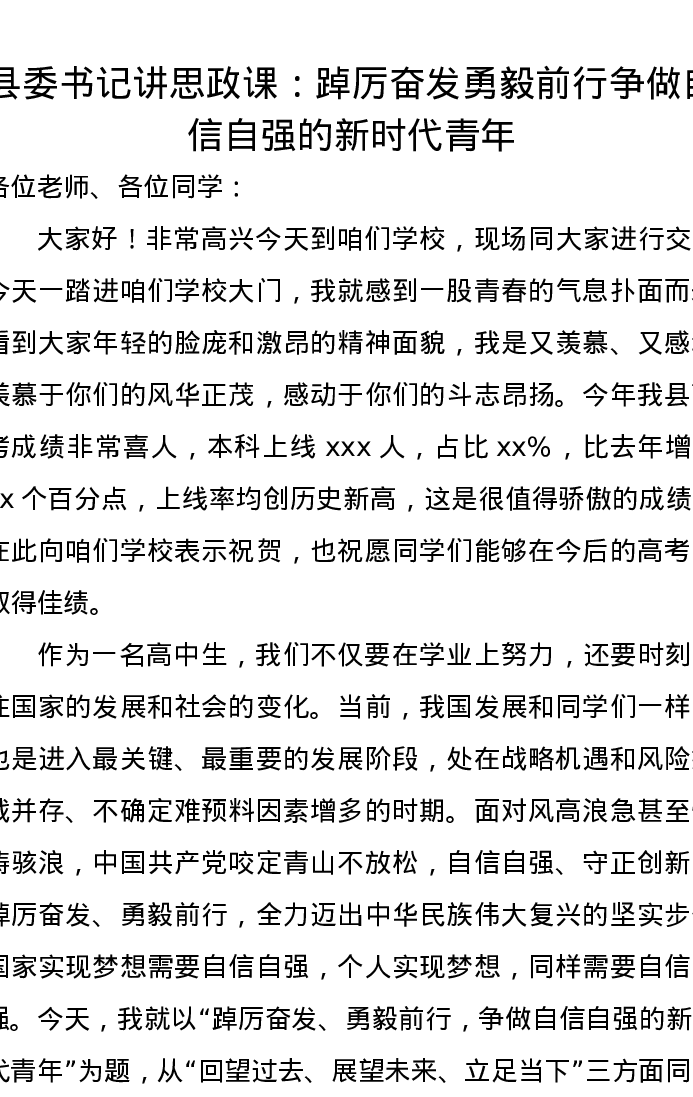 县委书记讲思政课讲稿:踔厉奋发勇毅前行争做自信自强的新时代青年