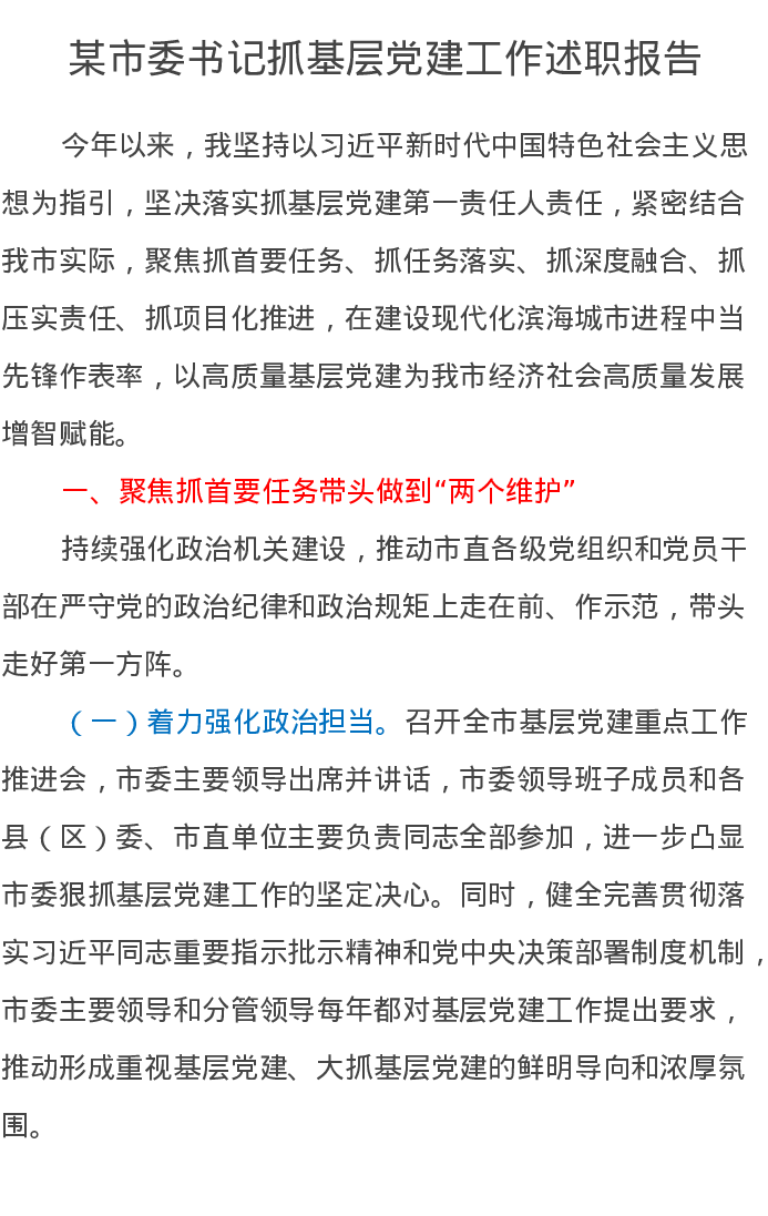 某市委书记抓基层党建工作述职报告