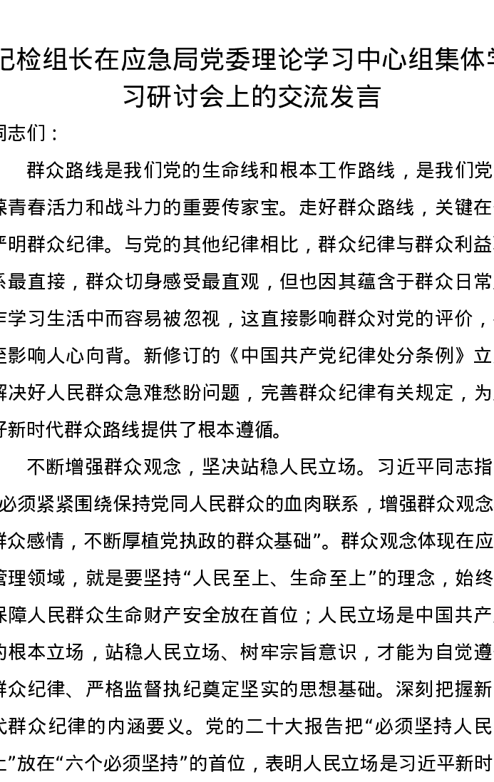 纪检组长在应急局党委理论学习中心组集体学习研讨会上的交流发言