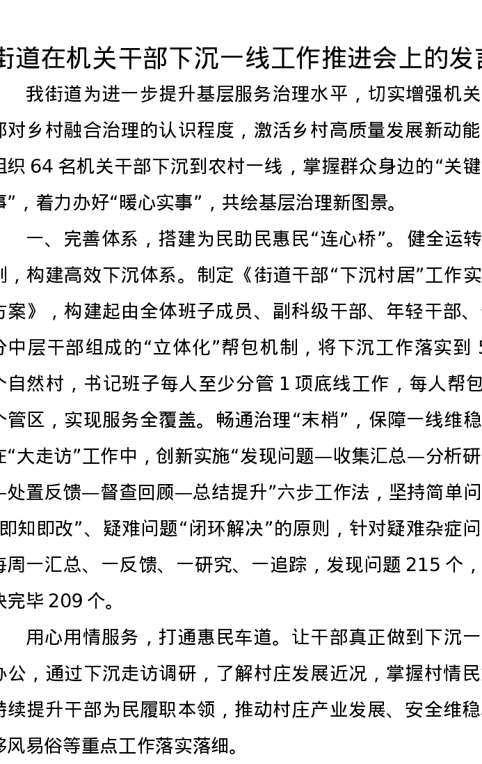 街道在机关干部下沉一线工作推进会上的发言