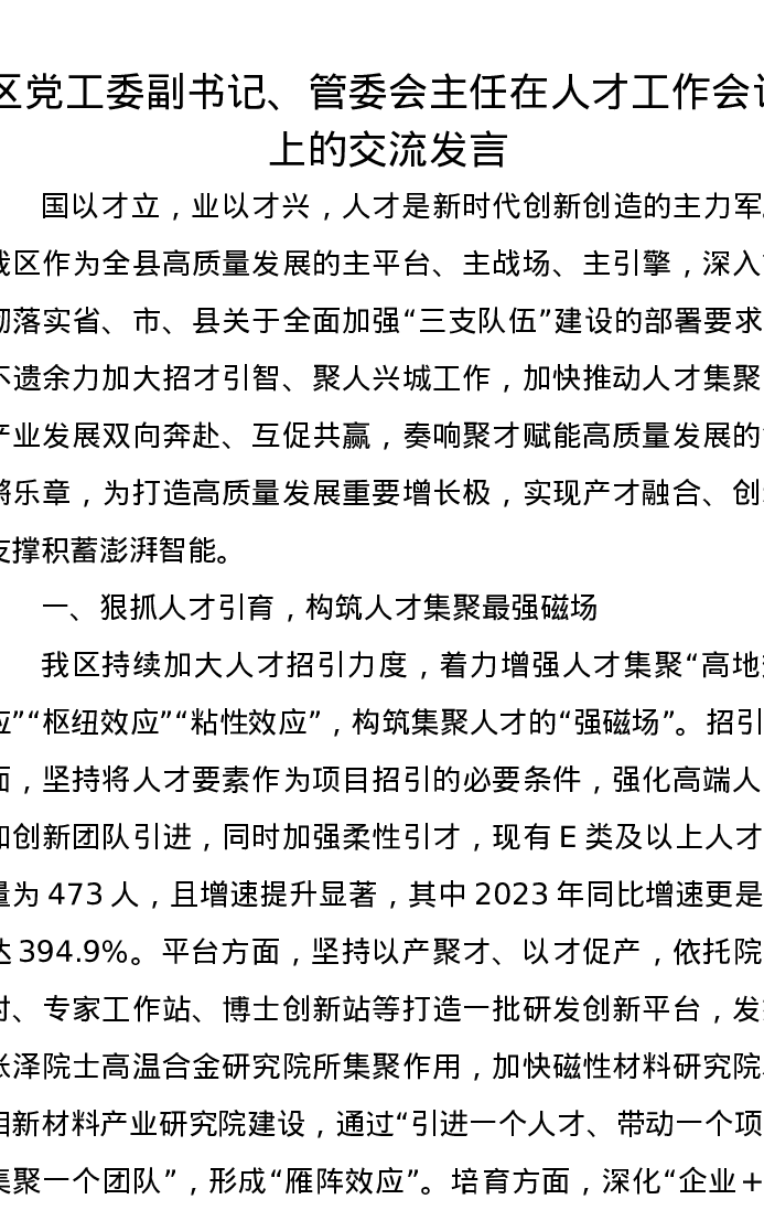 区党工委副书记、管委会主任在人才工作会议上的交流发言
