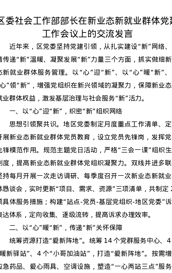 区委社会工作部部长在新业态新就业群体党建工作会议上的交流发言