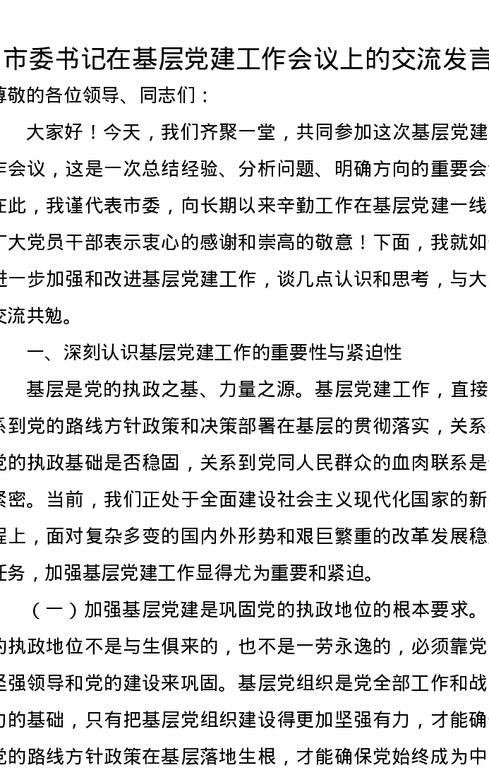市委书记在基层党建工作会议上的交流发言