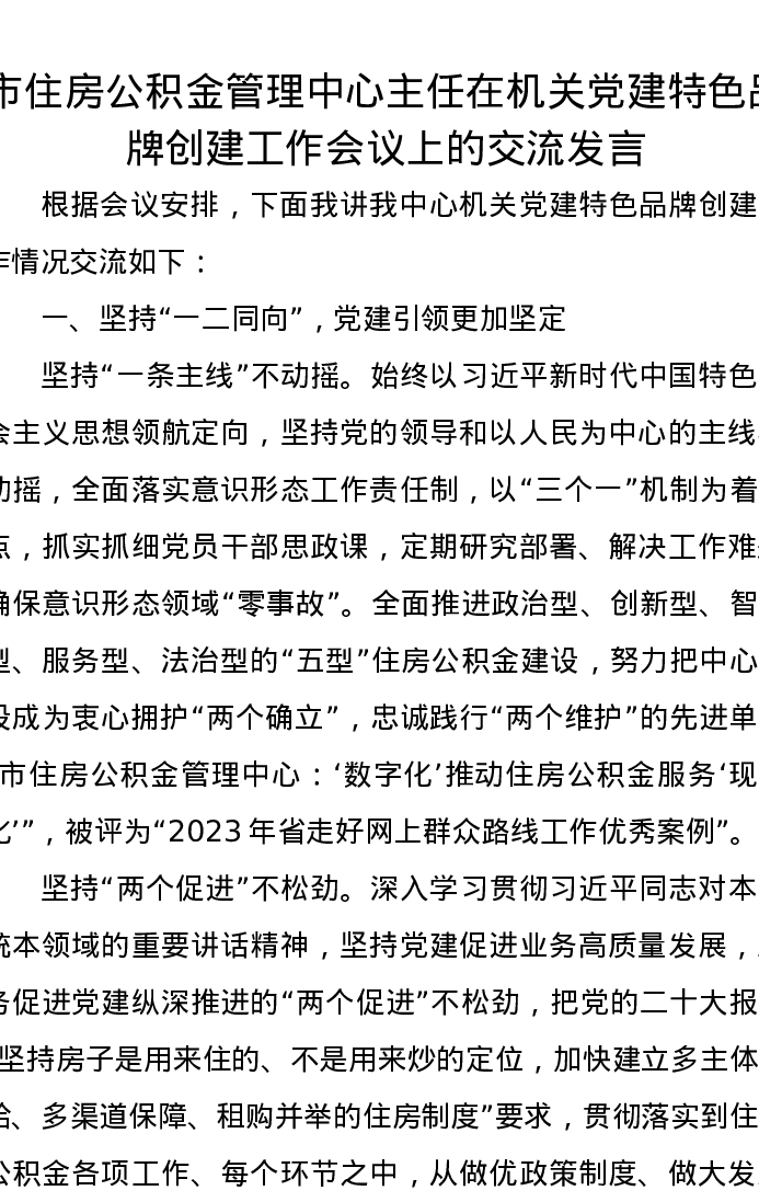 市住房公积金管理中心主任在机关党建特色品牌创建工作会议上的交流发言