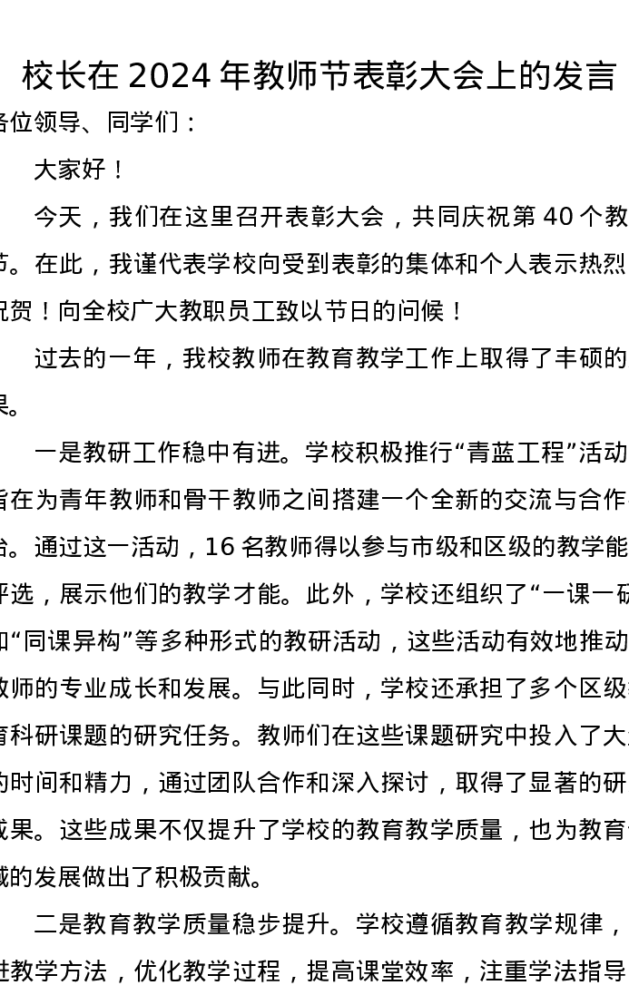 校长在2024年教师节表彰大会上的发言