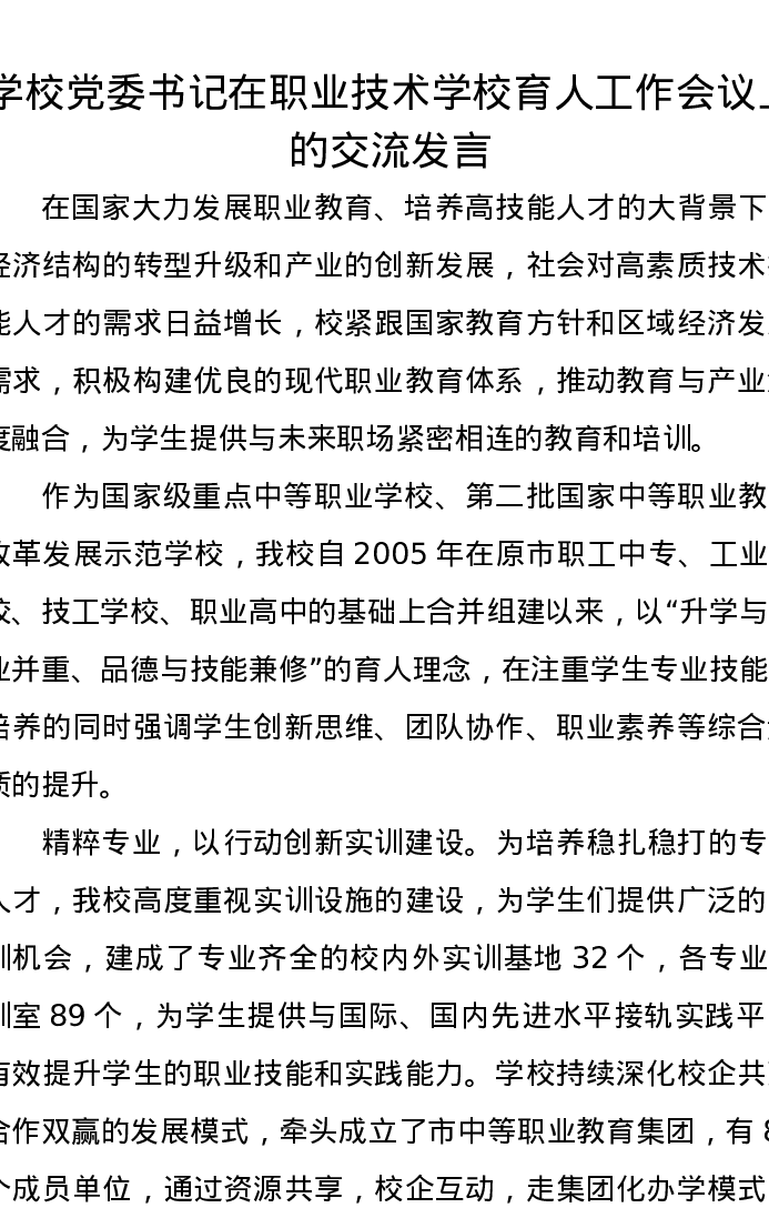 学校党委书记在职业技术学校育人工作会议上的交流发言