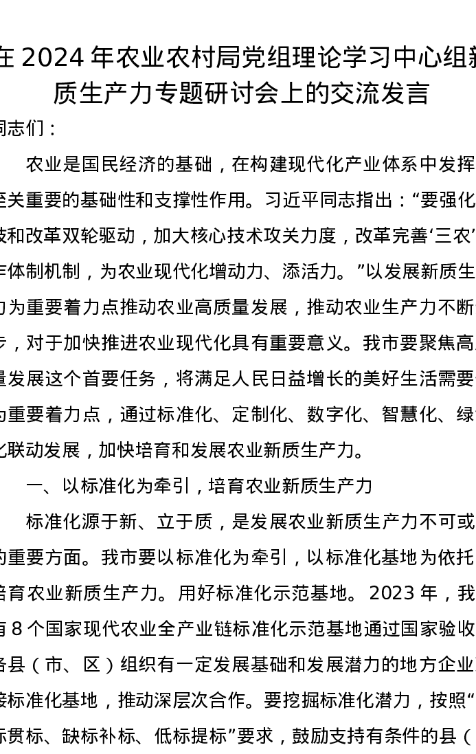 在2024年农业农村局党组理论学习中心组新质生产力专题研讨会上的交流发言