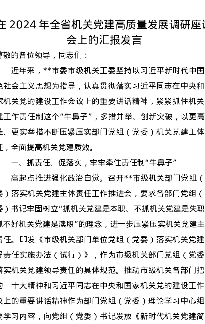 在2024年全省机关党建高质量发展调研座谈会上的汇报发言