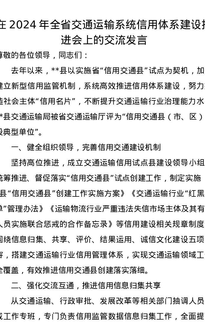 在2024年全省交通运输系统信用体系建设推进会上的交流发言