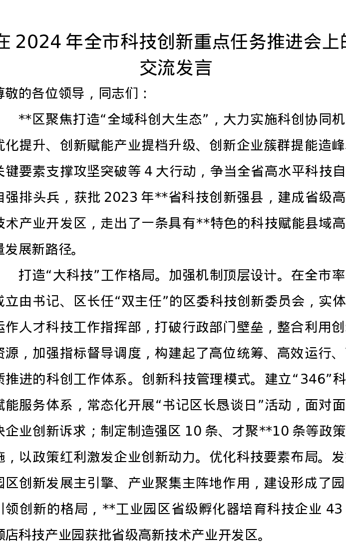 在2024年全市科技创新重点任务推进会上的交流发言