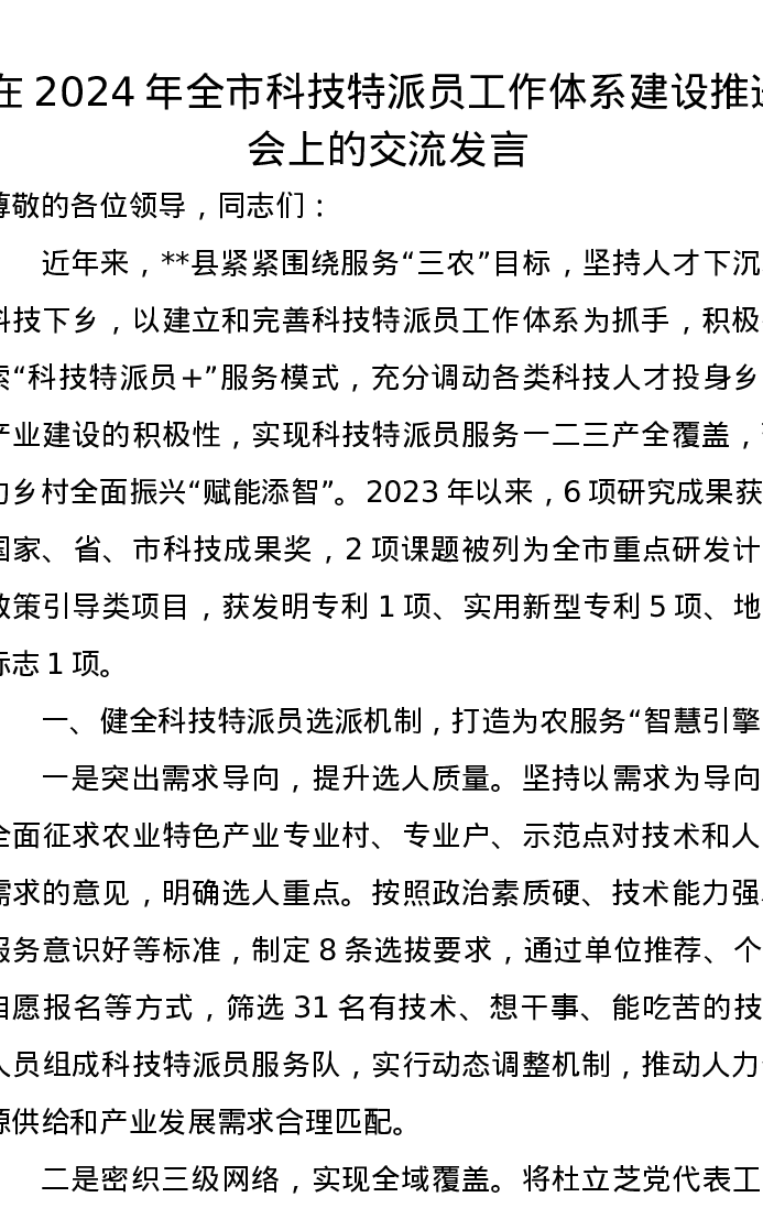 在2024年全市科技特派员工作体系建设推进会上的交流发言
