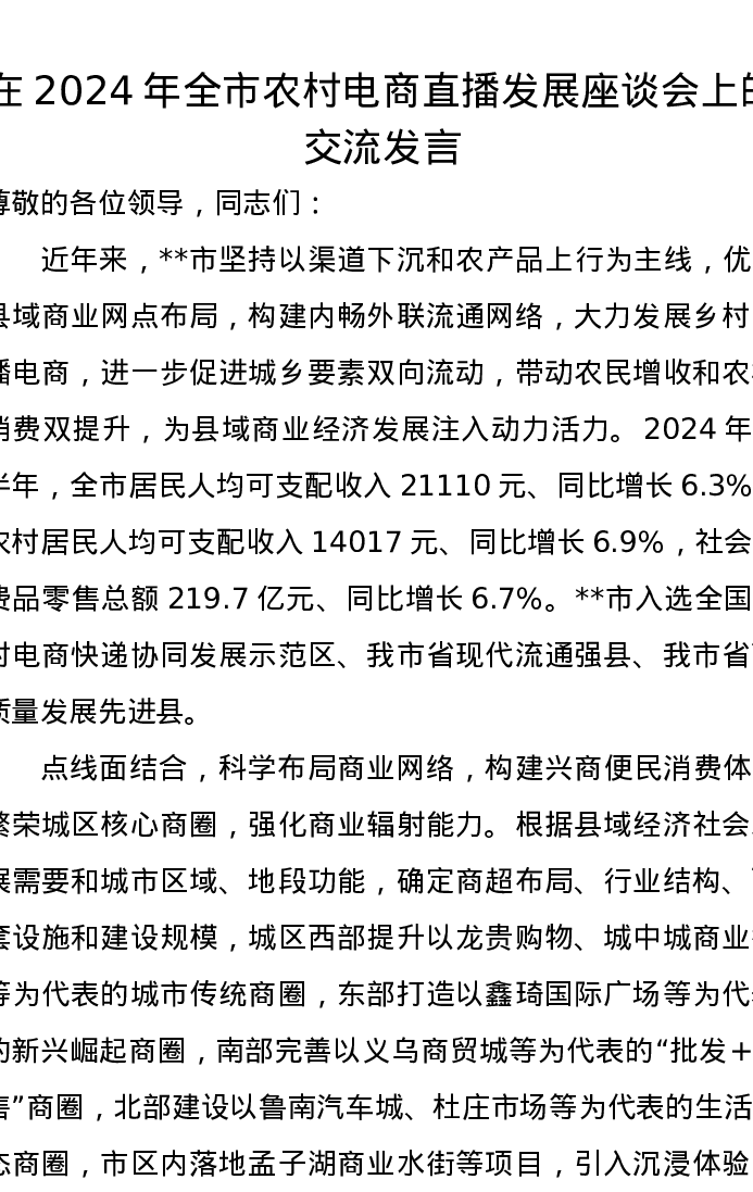 在2024年全市农村电商直播发展座谈会上的交流发言