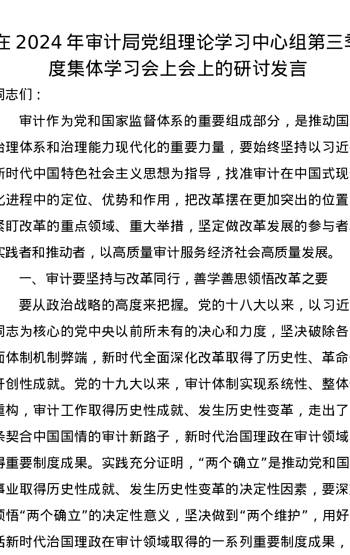 在2024年审计局党组理论学习中心组第三季度集体学习会上会上的研讨发言