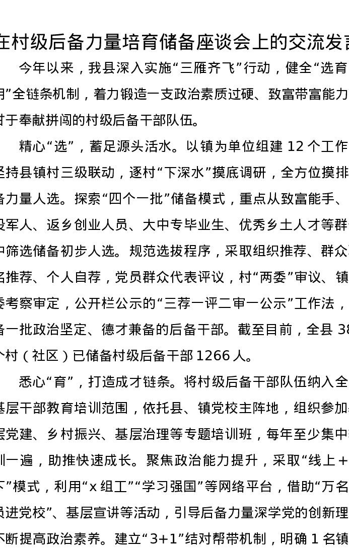 在村级后备力量培育储备座谈会上的交流发言
