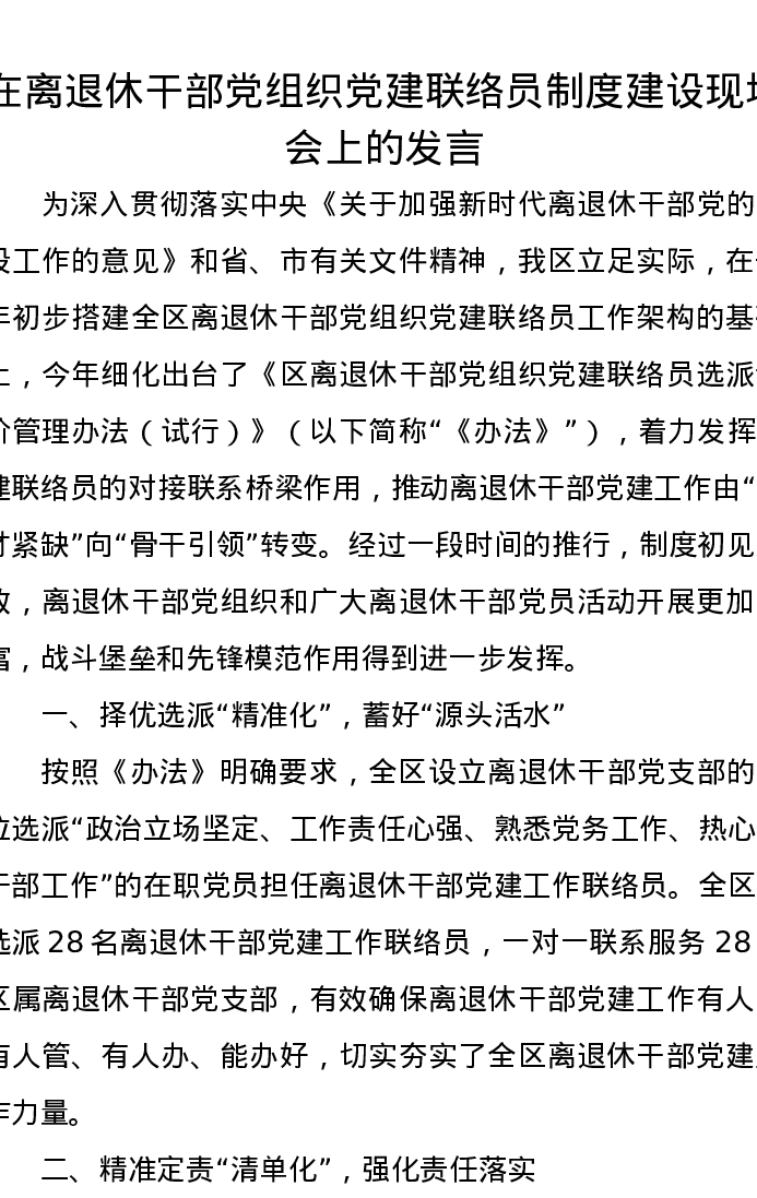在离退休干部党组织党建联络员制度建设现场会上的发言