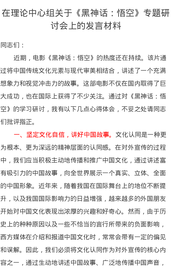 在理论中心组关于《黑神话:悟空》专题研讨会上的发言材料1