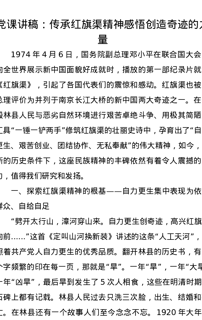 党课讲稿:传承红旗渠精神感悟创造奇迹的力量