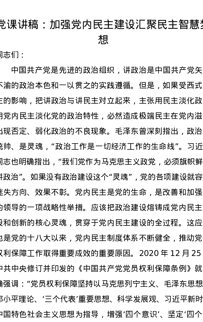 党课讲稿:加强党内民主建设汇聚民主智慧梦想
