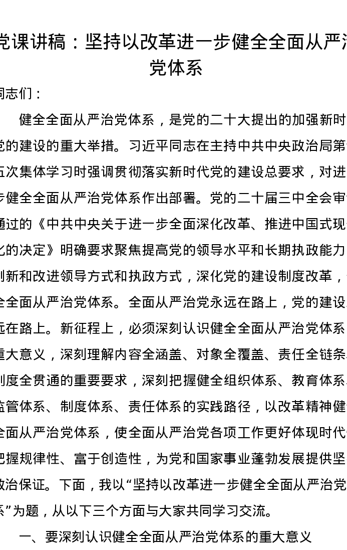 党课讲稿:坚持以改革进一步健全全面从严治党体系