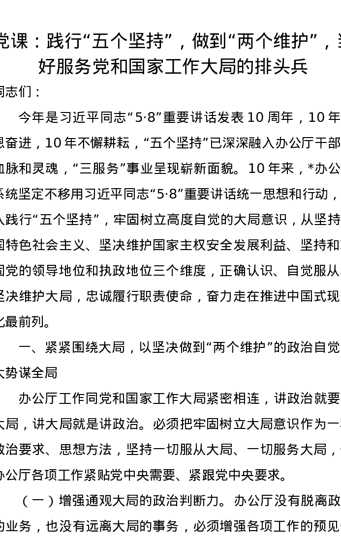党课讲稿:践行“五个坚持”,做到“两个维护”,当好服务党和国家工作大局的排头兵