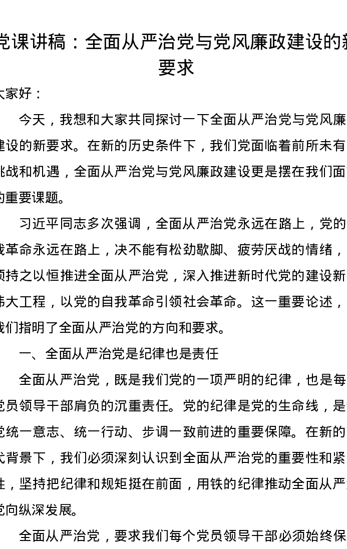 党课讲稿:全面从严治党与党风廉政建设的新要求