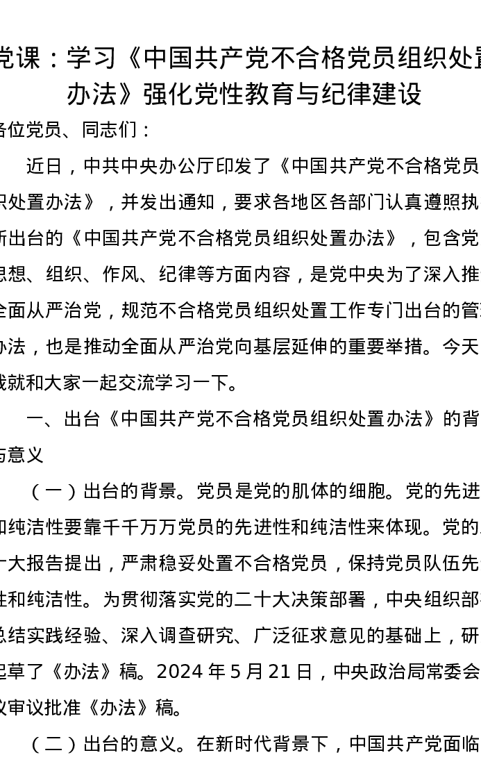 党课讲稿:学习《中国共产党不合格党员组织处置办法》强化党性教育与纪律建设