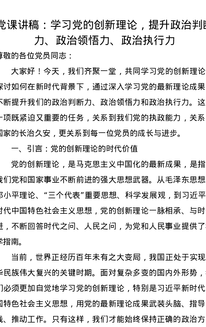 党课讲稿:学习党的创新理论,提升政治判断力、政治领悟力、政治执行力