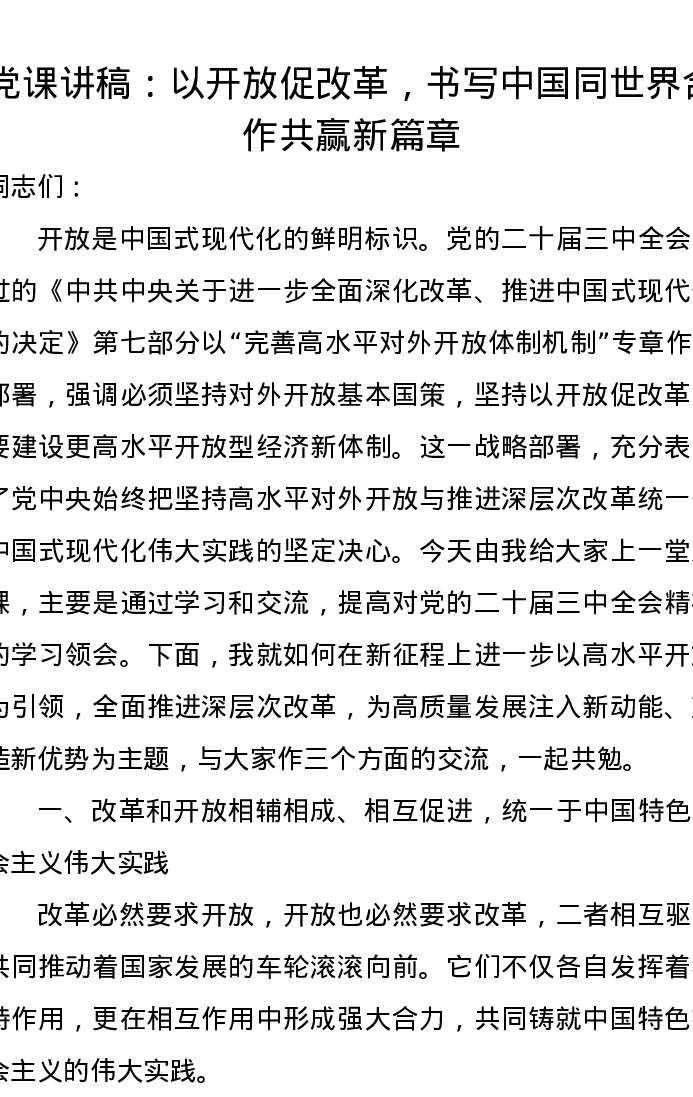 党课讲稿:以开放促改革,书写中国同世界合作共赢新篇章
